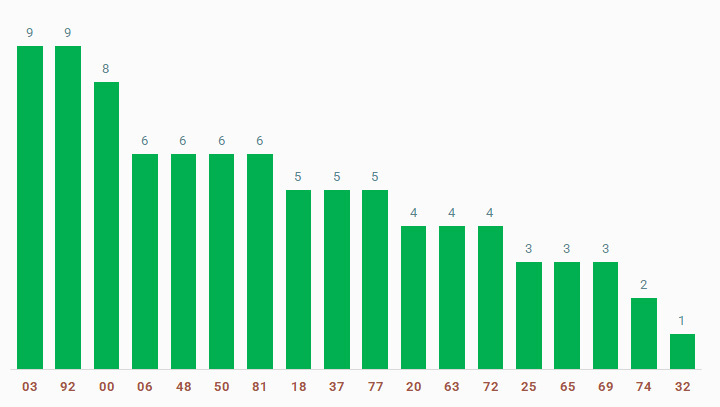 | Cặp số | Số lần về | Cặp số | Số lần về |